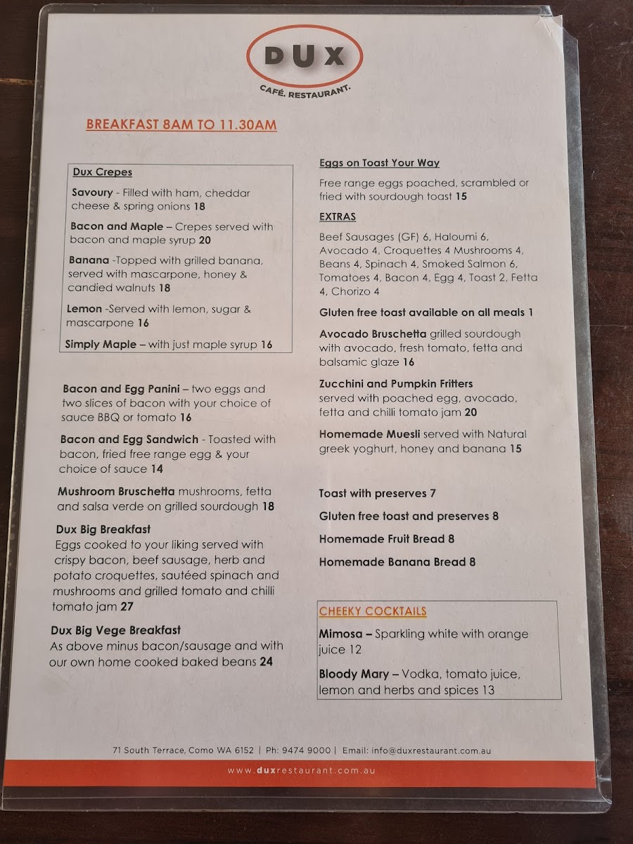 Families are also welcomed with a children’s menu offering fun selections, including chocolate hazelnut crepes for A$10.00 and ham & cheese toasted sandwiches for a mere A$8.00. The atmosphere is warm and inviting, making every meal feel special, as echoed by loyal customers who describe their experiences as genuinely welcoming. At Dux, every dish reflects a passion for quality and care, promising a memorable dining experience.